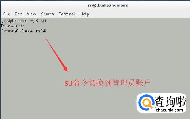 接下来在打开的终端中我们通过su命令将用户切换到管理员账户,如下图所示