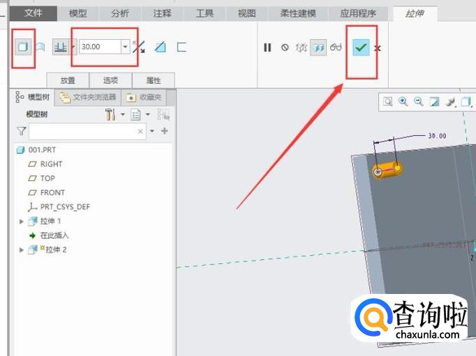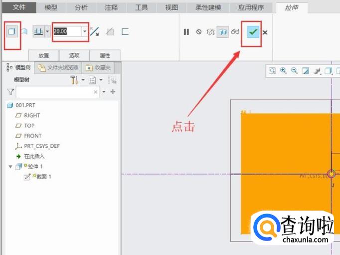 回到拉伸界面后,设置拉伸参数,拉伸为实体,深度值为20,点击“绿色对勾”退出即可,如图所示。