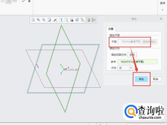 选择“拉伸”命令,以top面为草绘面,如图所示。