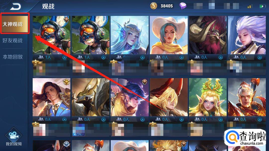 点开以后就可以看到大神观战、好友观战、本地回放三个选项。首先我们看到第一个,大神观战,喜欢看别人秀英雄的玩家可以在这上面学到很多东西。