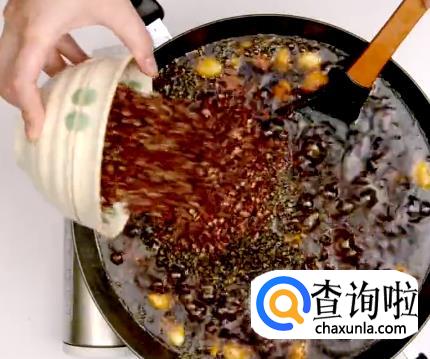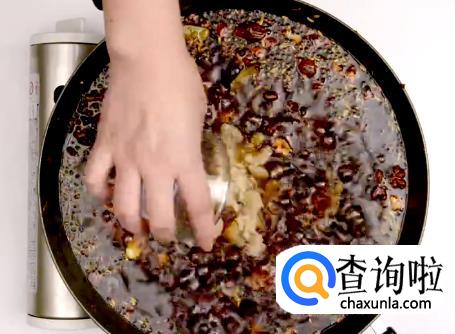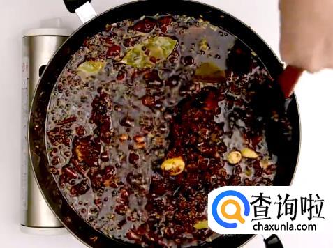倒入青花椒,红花椒,然后下八角,丁香,三萘,陈皮,草果,茴香,甘草,桂皮等香料,在油锅中不断翻炒。