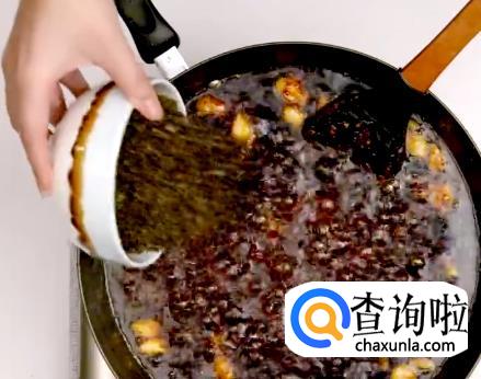 倒入豆豉,加一瓶白酒,不断混合底料,然后将煮透的葱段捞出。