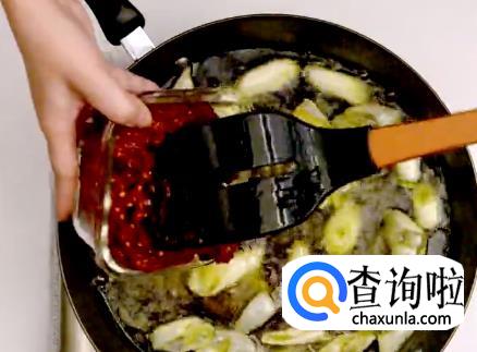 将葱段,大蒜,辣椒酱,豆瓣酱倒入油锅煎熬,用锅铲搅拌。