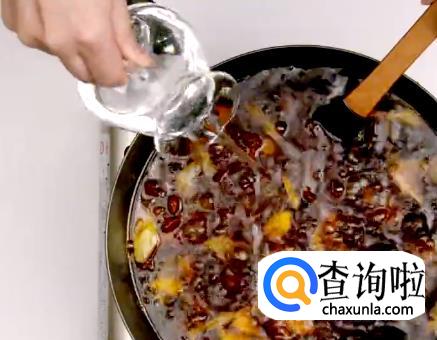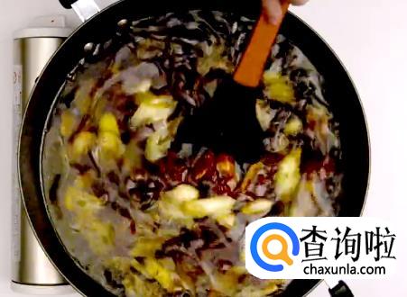 倒入大块冰糖和酒酿,不断翻炒直至冰糖融化。