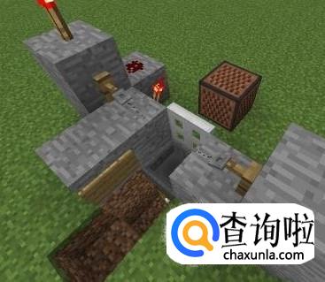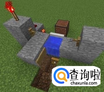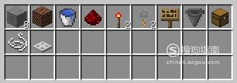 所需材料:8个石头(可替换成任意可放置红石的方块)、1个音符盒、1个水桶、1个红石、2个红石火把、2个绊线钩、1个告示牌、1个漏斗、1个箱子、1根线、1个铁活板门。