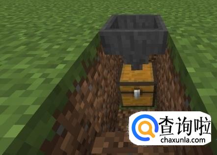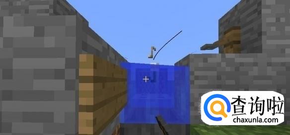 当有鱼上钩时,鱼漂下降,绊线钩解除激活,同时铁活板门升起,挡住音符盒,此时鼠标准星对着铁活板门,鱼线收回,这样钓到的东西就通过漏斗进到了箱子里。如图所示。
