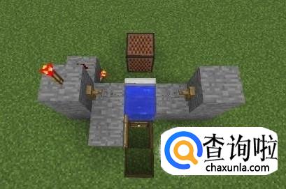 按图中所示放置红石装置。两个绊线钩之间放一根线;铁活板门放置方法如下图,保证是靠着漏斗且是立起来的状态;放告示牌是为了阻挡水流。如图所示。