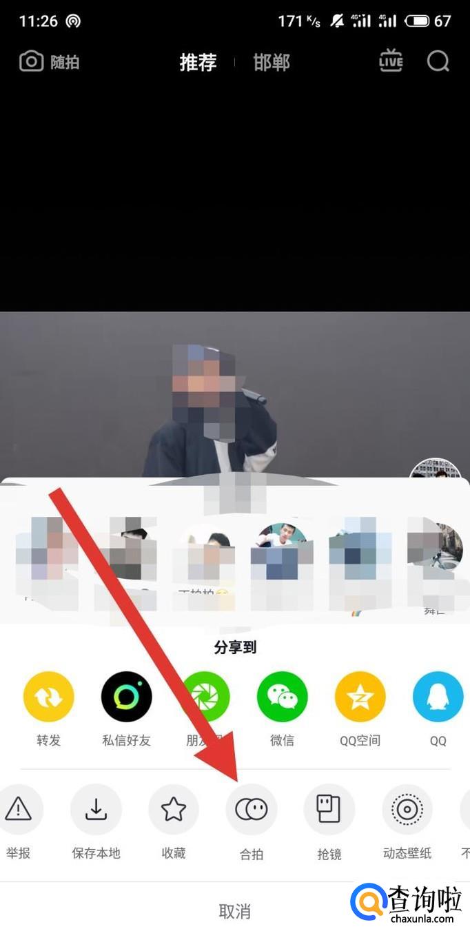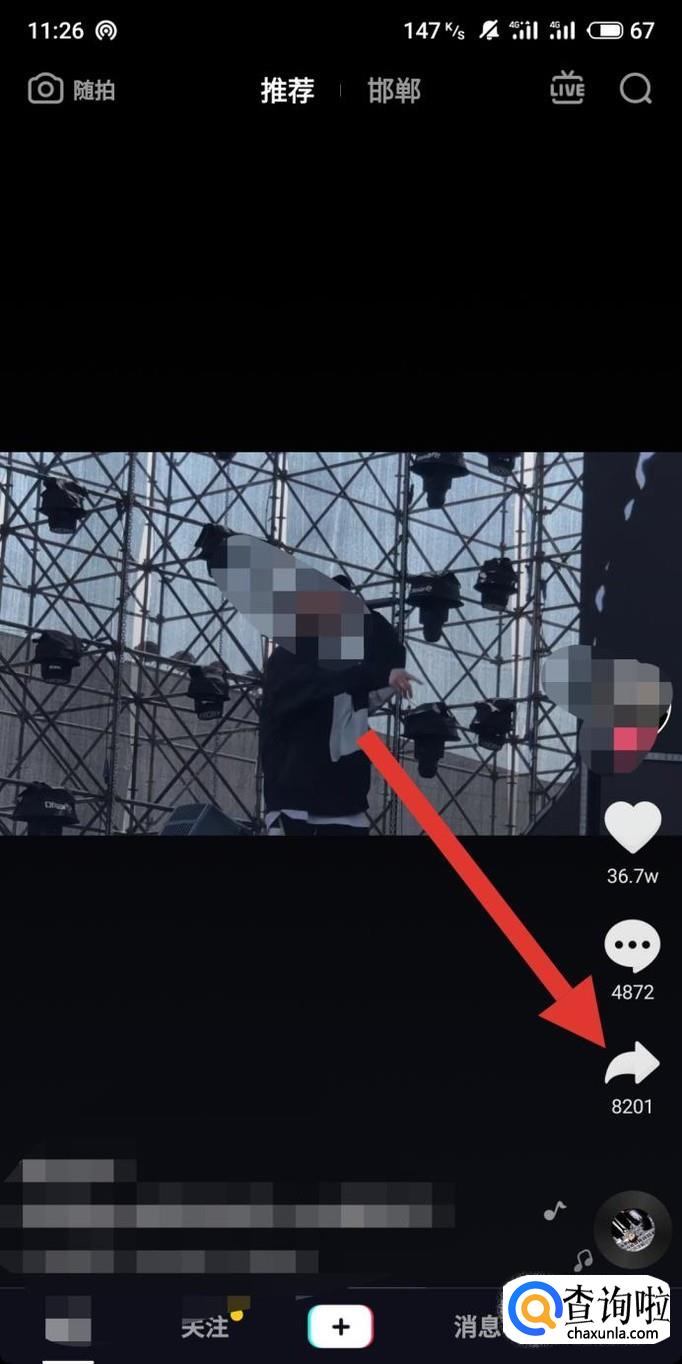 在抖音首页找到自己想要合拍的作品,点击“分享”按键,如图所示。