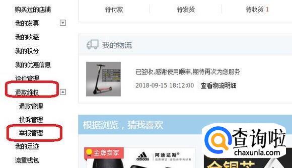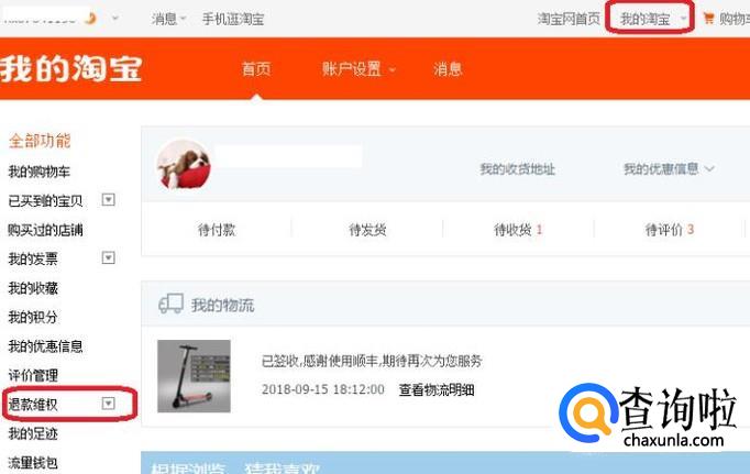 登录之后,如图所示,点击“我的淘宝”,进入个人页。在左侧栏里找到“退款维权”,点击一下。