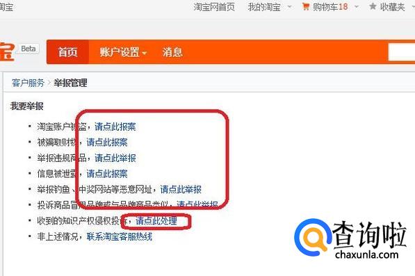 进入举报管理界面,如图所示,买家可以根据遇到的不同情况,分别点击进行举报,如果是卖家收到举报,就点击下方的“点此处理”。