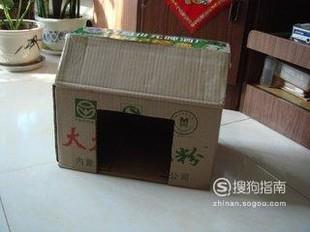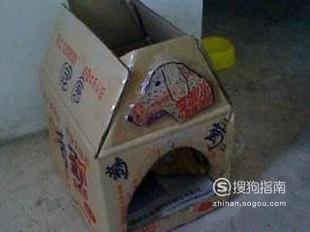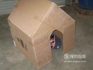 首先找到一个比狗大的箱子,再开口的那一面,把四个面的每个角剪下一部分来,可以让他们契合一起,组成窝的房顶,再在顶部盖上一块纸板,用胶带粘结实。