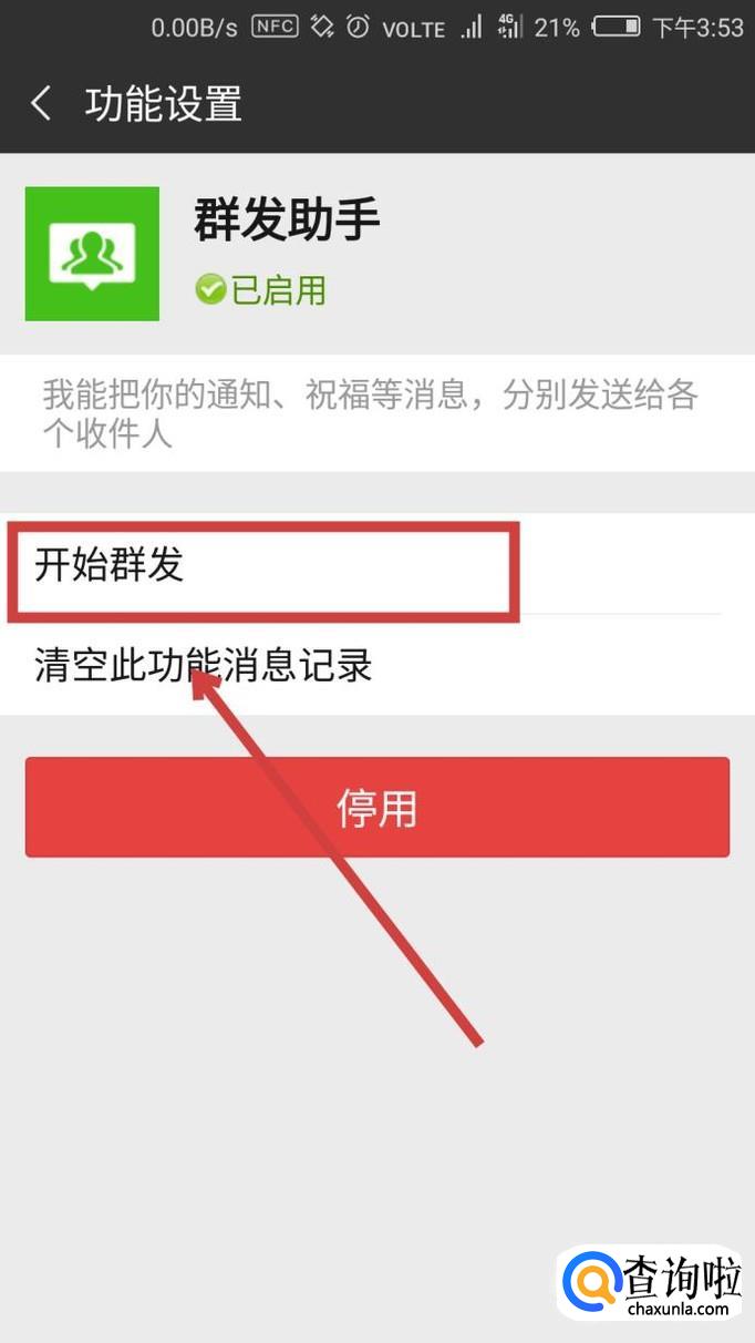 然后点击【开始群发】,点击进入。如果微信没有启用这个功能的话,启用即可。