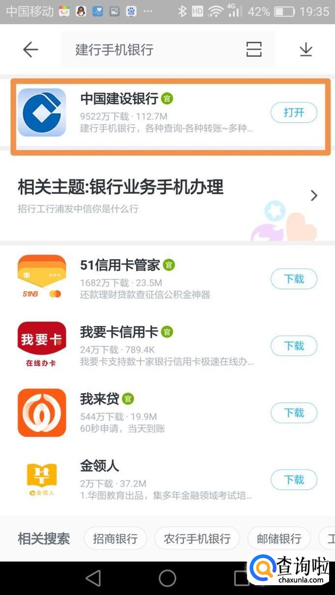 然后打开“百度手机助手”,在首页上方的搜索栏中输入“建行手机银行”就会出现“中国建设银行”,点击下载。