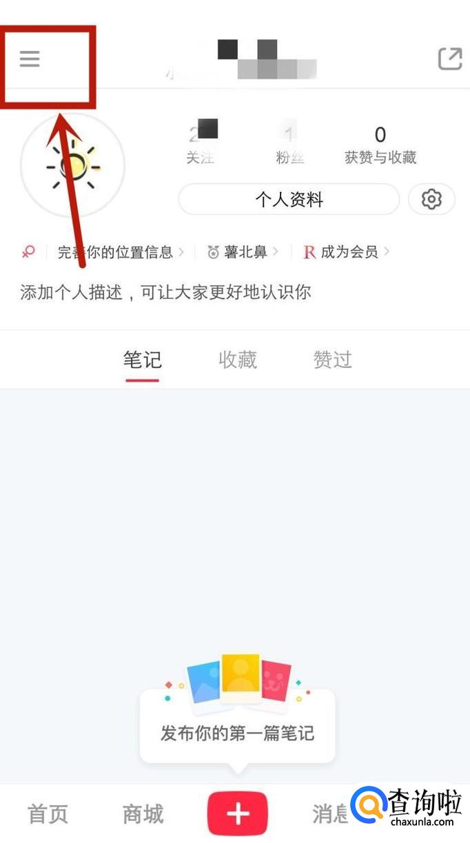 首先,打开手机上的小红书进入,进入后完成个人信息的登录,再点击左上角的三横标志进入。