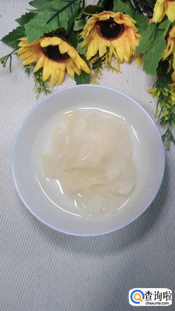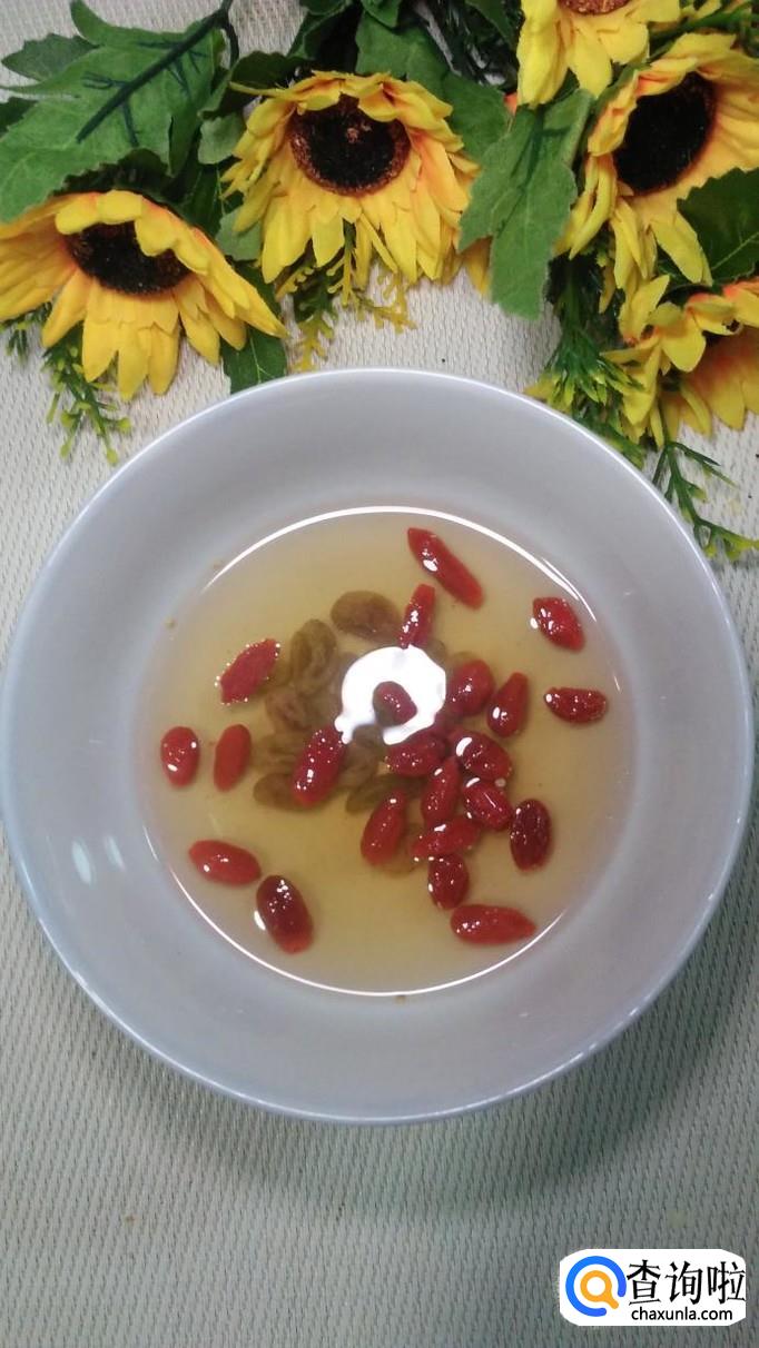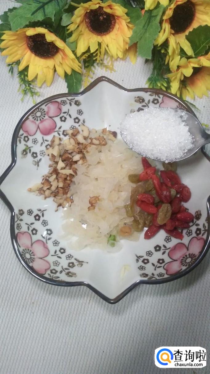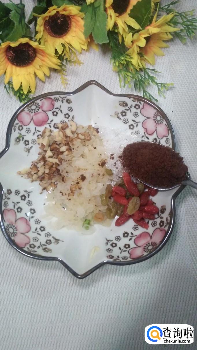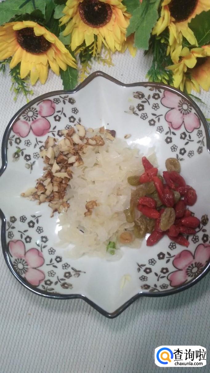 准备一个生核桃,去皮后取出果仁,再准备适量银耳泡发,葡萄干和枸杞子用清水泡软。