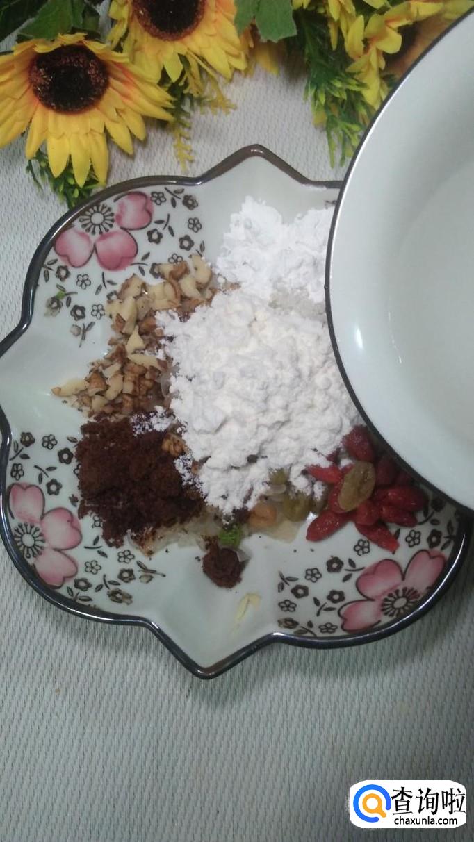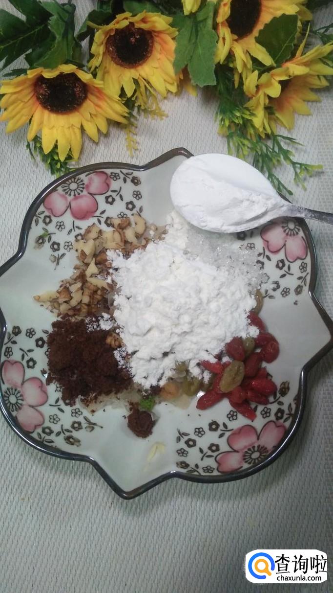 丝瓜适量,核桃适量,枸杞适量,葡萄干适量,银耳适量,白砂糖适量,红糖适量,糯米粉适量,面粉适量。