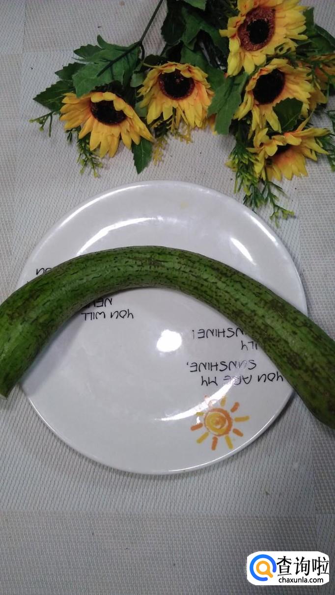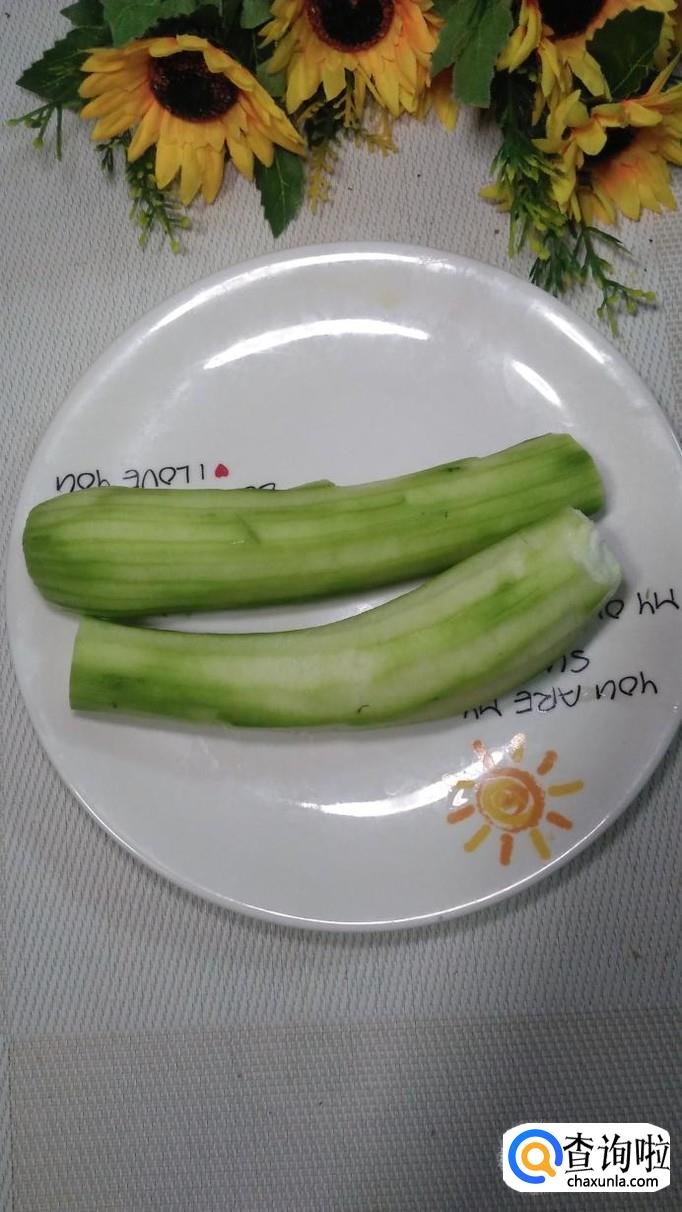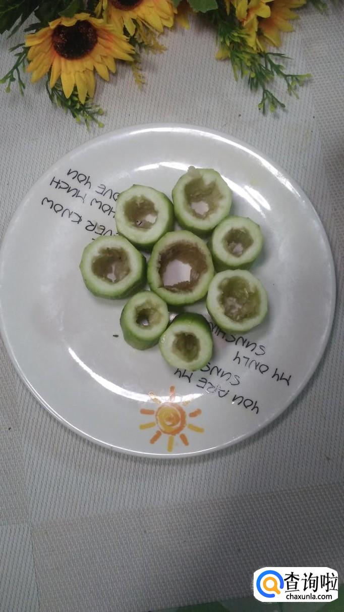 准备一根丝瓜,洗净后去除外皮,切成两厘米高的圆柱体,中间做一个小洞,放入盘中备用。