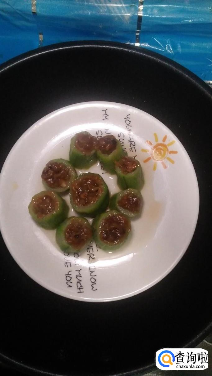 然后将果泥放入丝瓜中间的小洞中,放入盘中,准备上蒸锅。