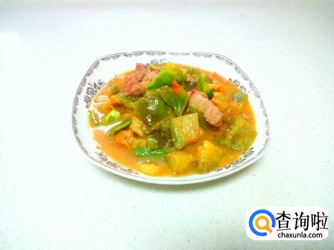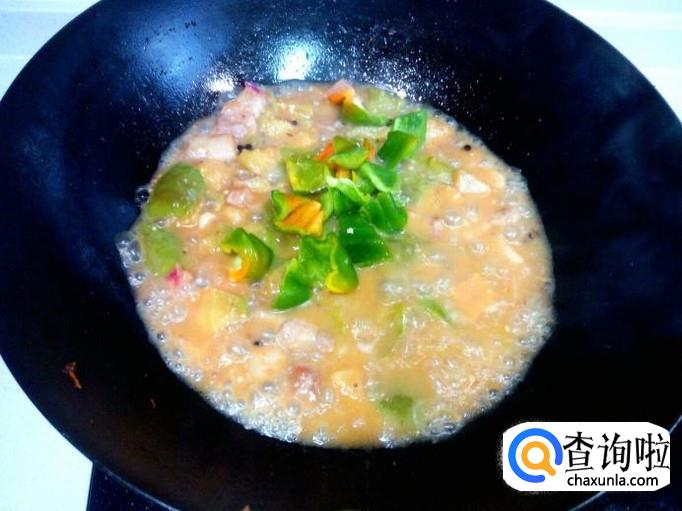 大约炖20~25分钟的时间,茄子炖熟后(留少许汤汁,不要把汤汁炖干),放入青椒,稍翻动一下,放入味精,关火。