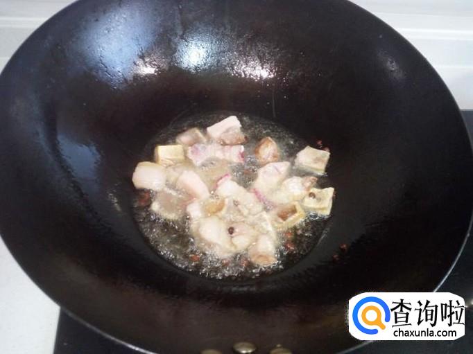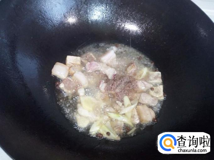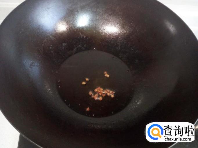 锅内放入油加热,油热后放入花椒爆香。放入肉翻炒。