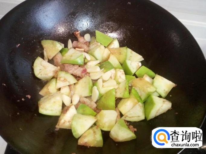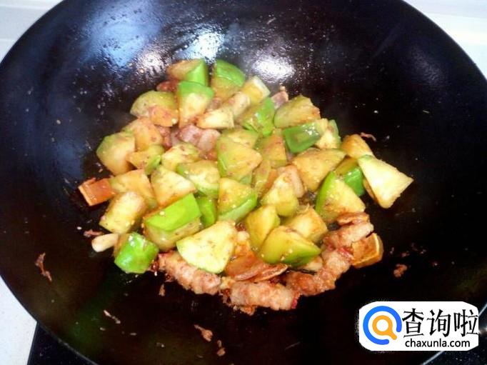 炒至猪肉下猪油,颜色微白,放入一匙儿虾酱,放入葱,姜,翻炒出香味。然后放入茄子,放入蒜翻炒。