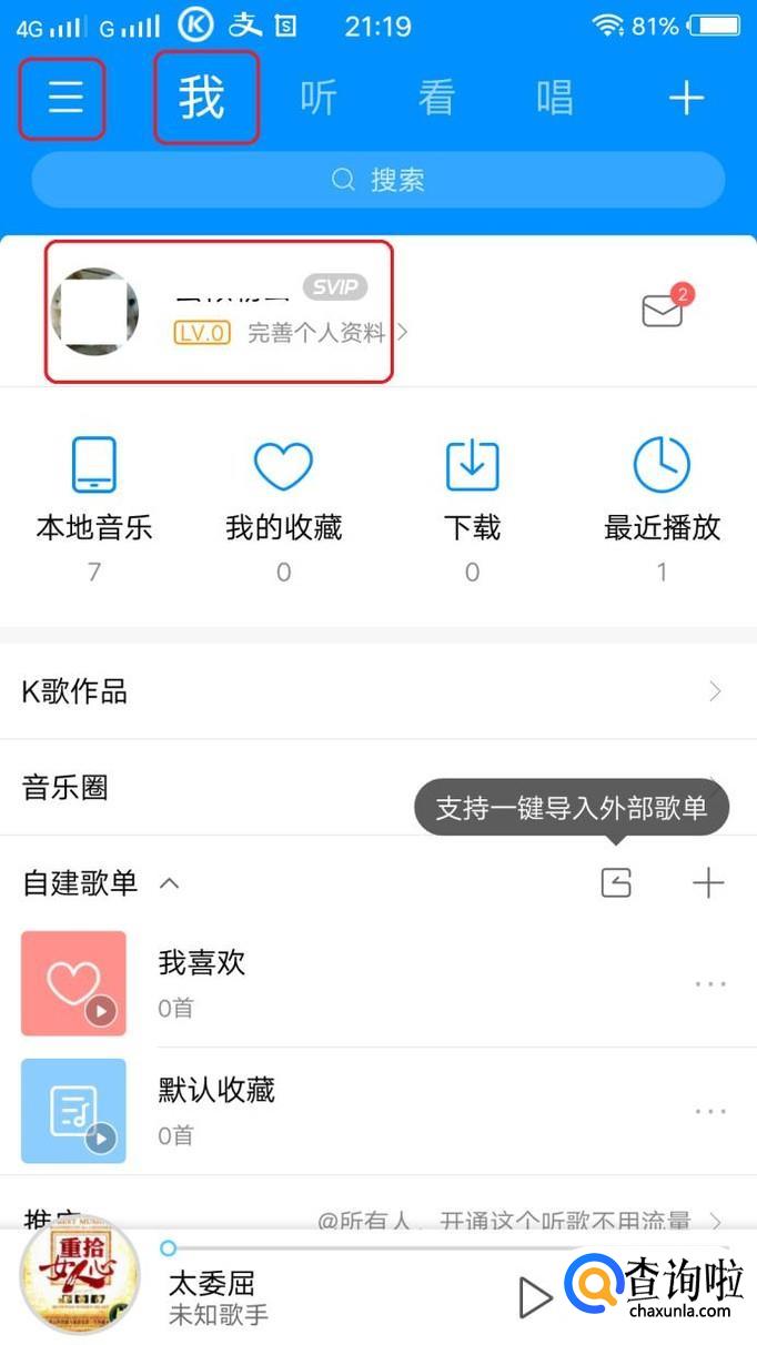首先,我们打开手机酷狗音乐,如图所示,点击“我”,点击头像进入登录状态。登录后我们点击左上角图标。