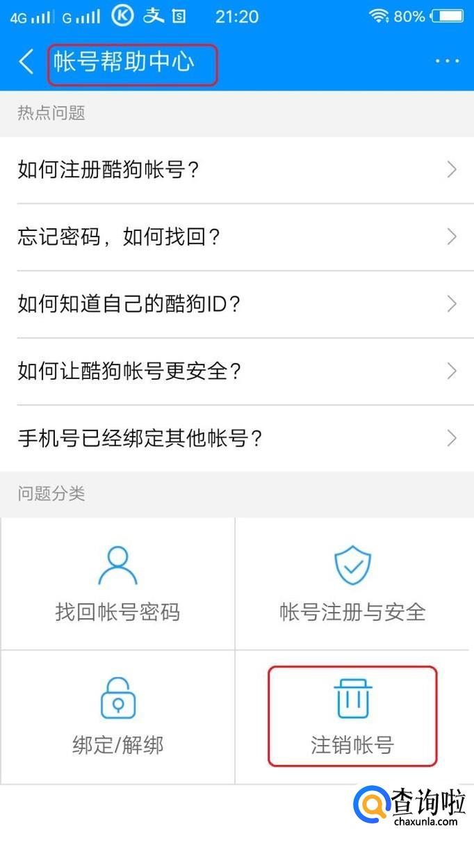 此时,就能看到“注销账号”图标了,在问题分类里面。我们点击进入。