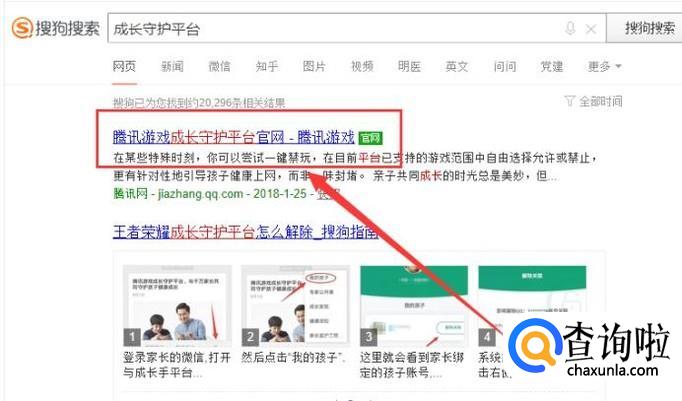 打开搜狗搜索,搜索“成长守护平台”,点击链接并进入,如图所示。