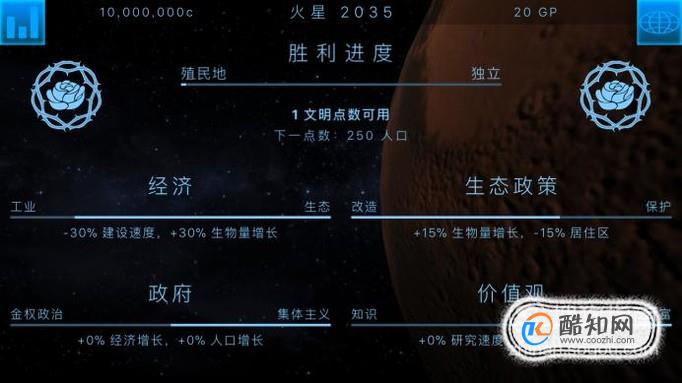 游戏主界面的文明里,可以看到你目前的政策,当你拥有文明点数的时候,可以来一点点来改变这些政策。最上方的殖民和独立,当你达到100的时候就独立,游戏进度就完成了。