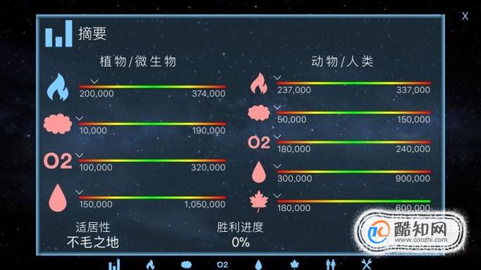 游戏左上角图标形状的按钮,点击可以看到你目前的摘要,往右滑动可以看到每一项参数,看看你离人类生存的参数还差多少。