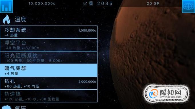 回到游戏主界面,我们点击研究,这里边需要消耗资源来研究人,大气,温度,水,生物等等,记住,游戏一开始什么都没有,包括微生物都没有,全部需要研究,慢慢培养。完全是比原始世界都不如。我们一般是先研究提升大气压的科技,然后是降低温度的。