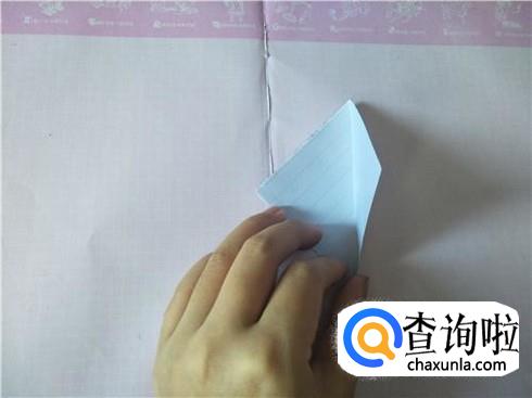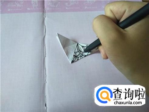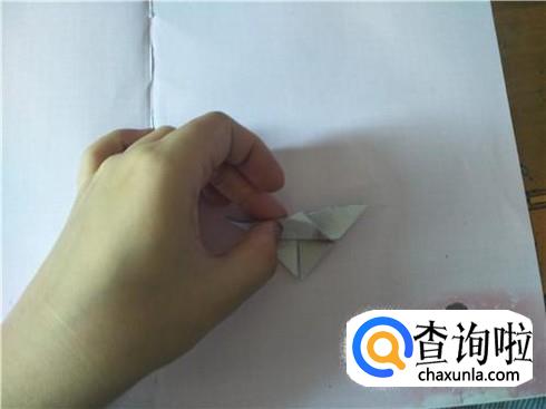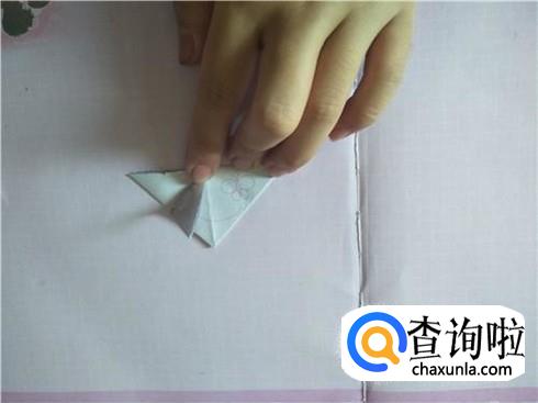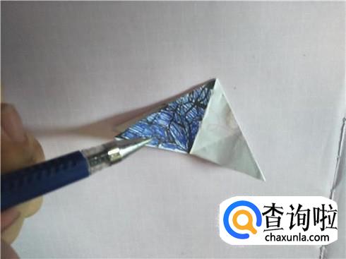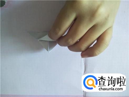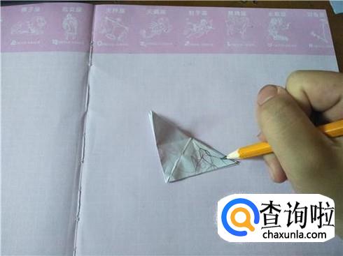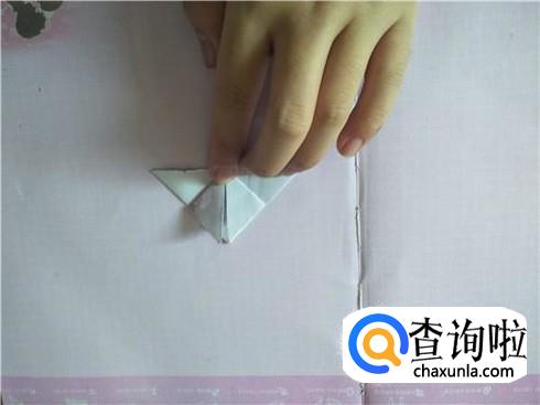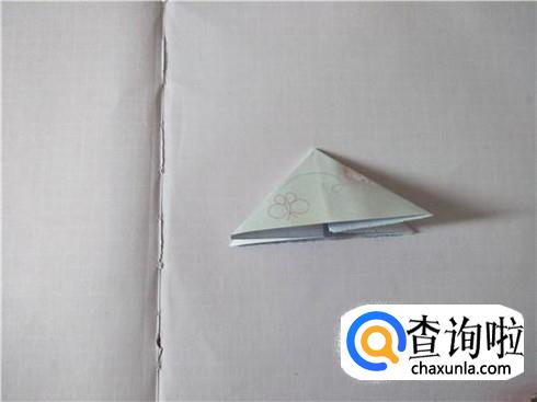 然后将它进行对折,形成一条折痕。接着在其中一面言者,折痕,进行对折,最后形成的是类似于一个菱形的图形,但是它的背面还是一个三角形。