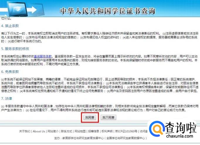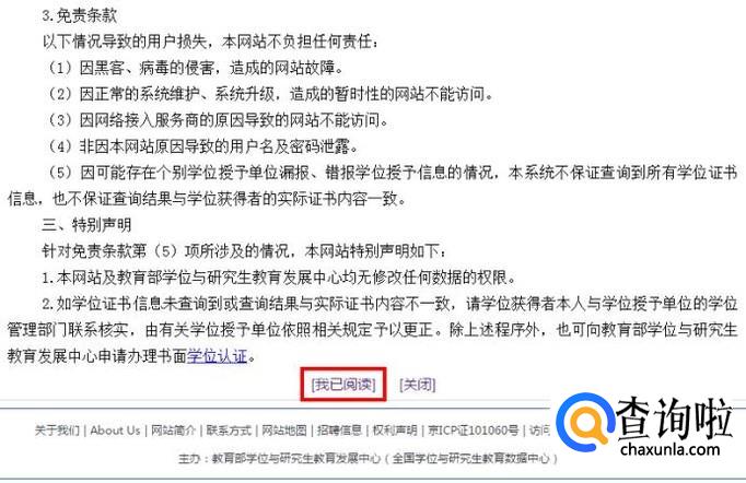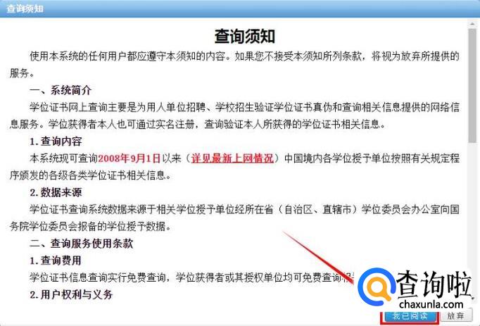 查询须知页面下方点击“我已阅读”,查询服务条款页面下方点击“我同意”;