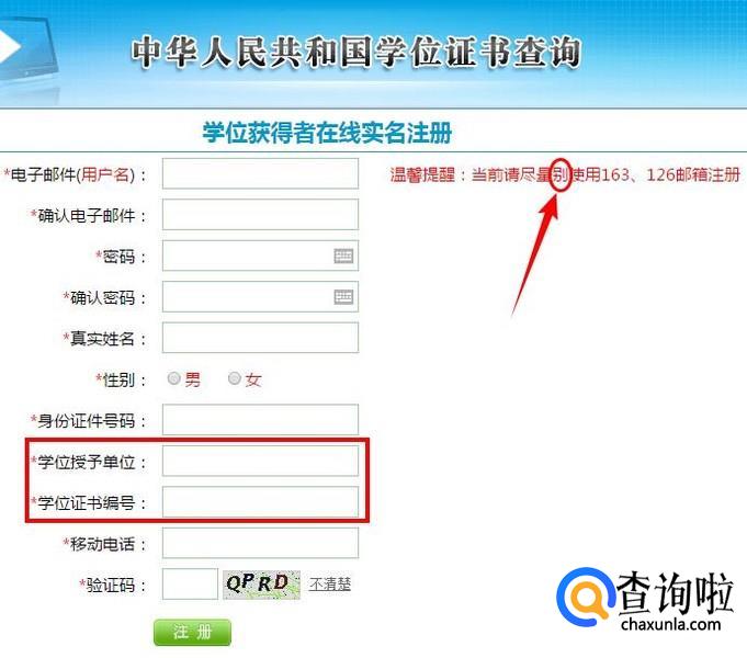 来到实名注册页面,所有内容都是必填项,注册邮箱提示别用136、126邮箱,还要找到自己的学位证,将毕业院校和证书编号填到“学校授予单位”和“学校证书编号”中,都填好以后,点击注册;