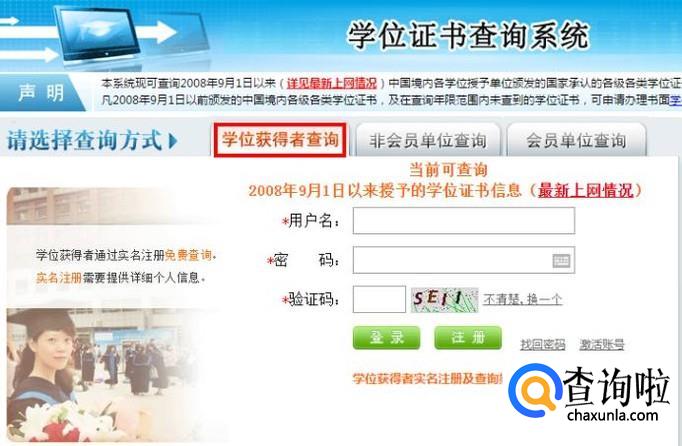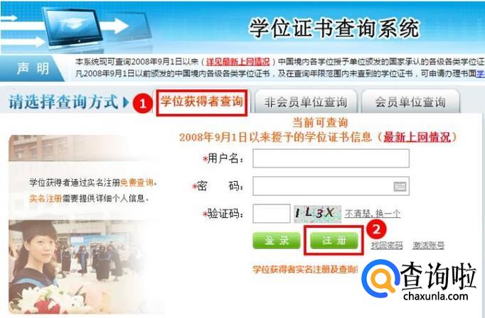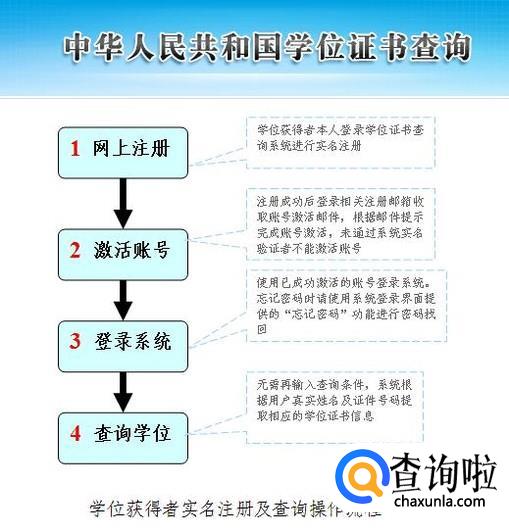 选择“学位获得者查询”,首次使用先要注册,注册查询流程如图;