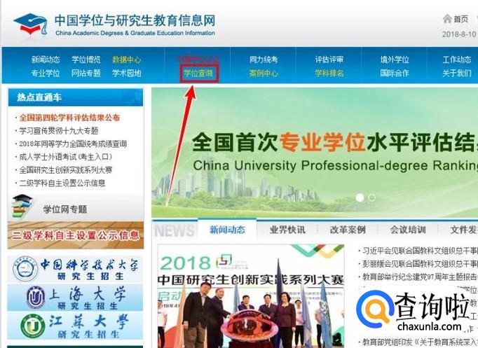 打开首页以后,在上方菜单栏找到“学位查询”,点击;