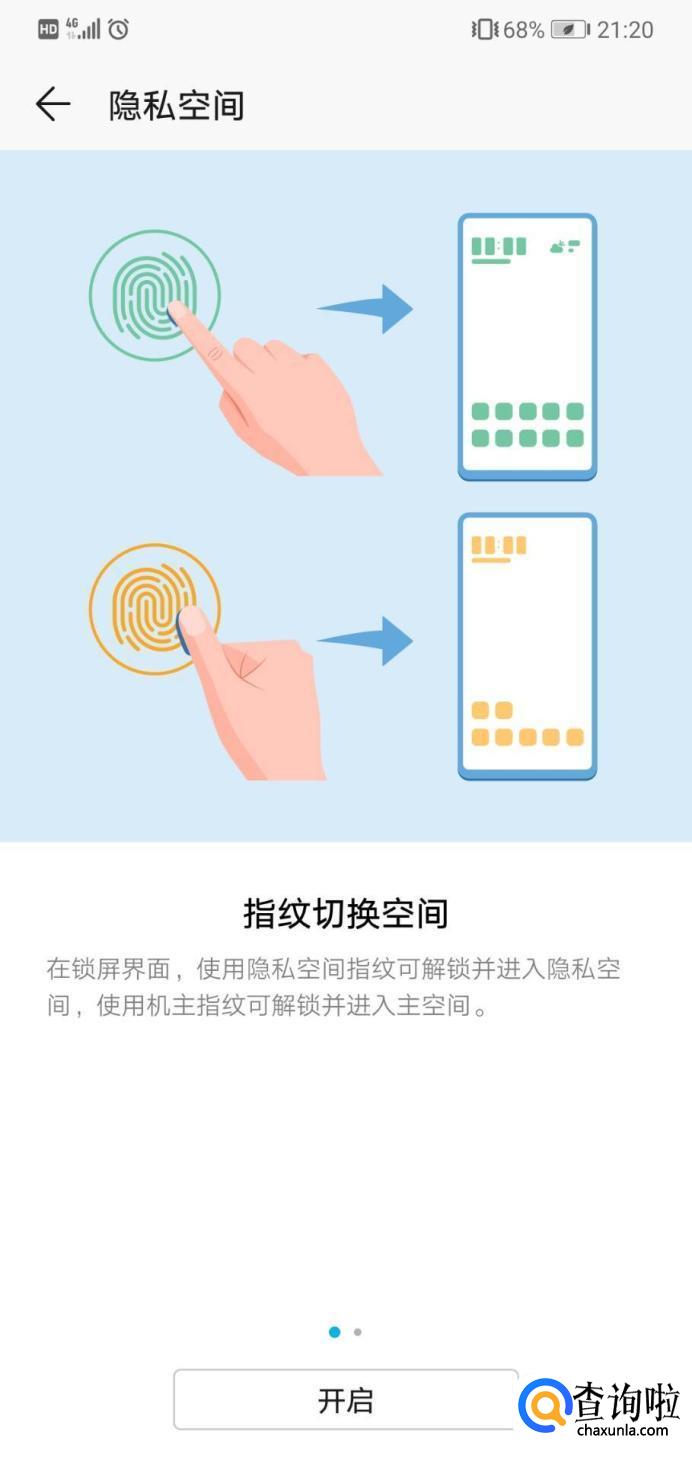 如图可以选择指纹关联,也可以选择取消。开启后,你手机里的所有东西都在隐私空间里了。