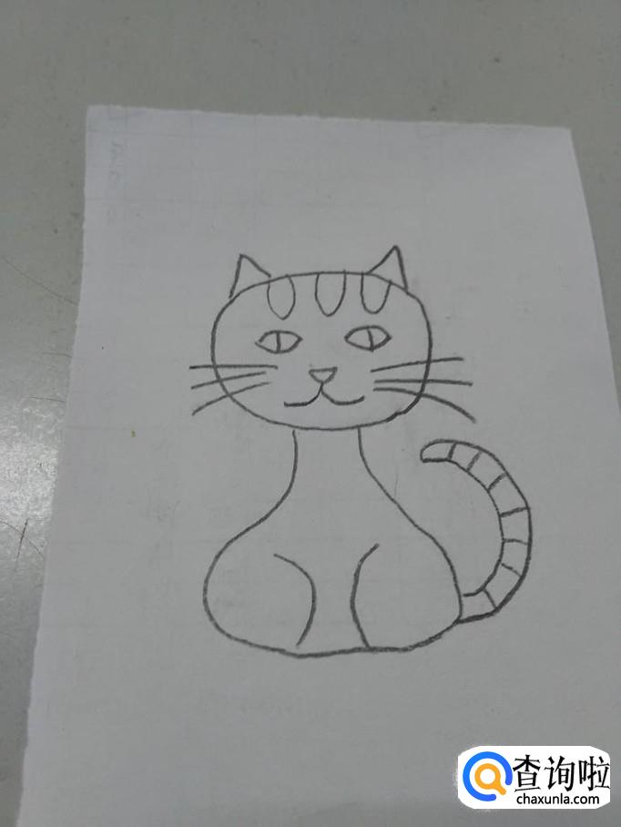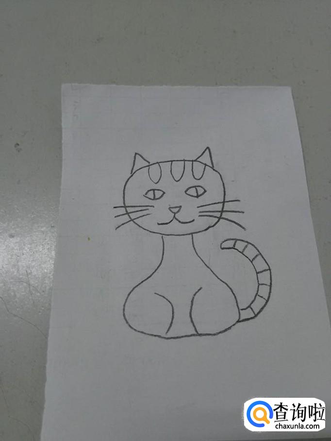最后在小猫身体右侧,画一条长长的、弯弯的尾巴,在尾巴上画一些短横线,表示尾巴上的花纹,可爱的小猫就画完了。