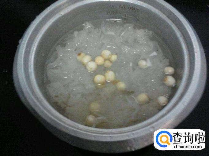 在泡银耳的时候,同时将莲子泡发,待莲子泡软之后去掉莲子心。