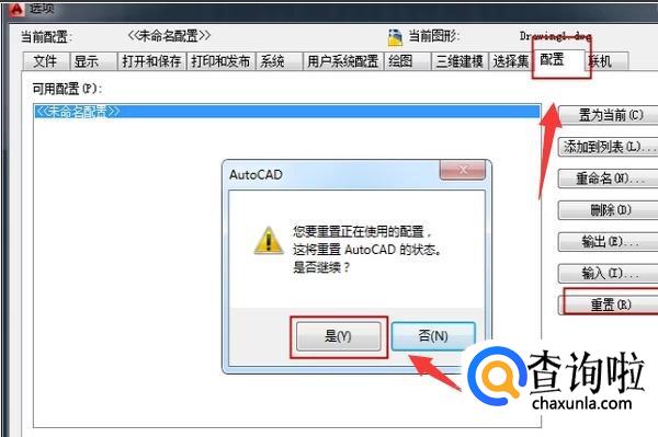 在选项中选择【配置】,再点击【重置】,点击之后会出现一个对话框,选择【是】,然后关闭CAD软件。
