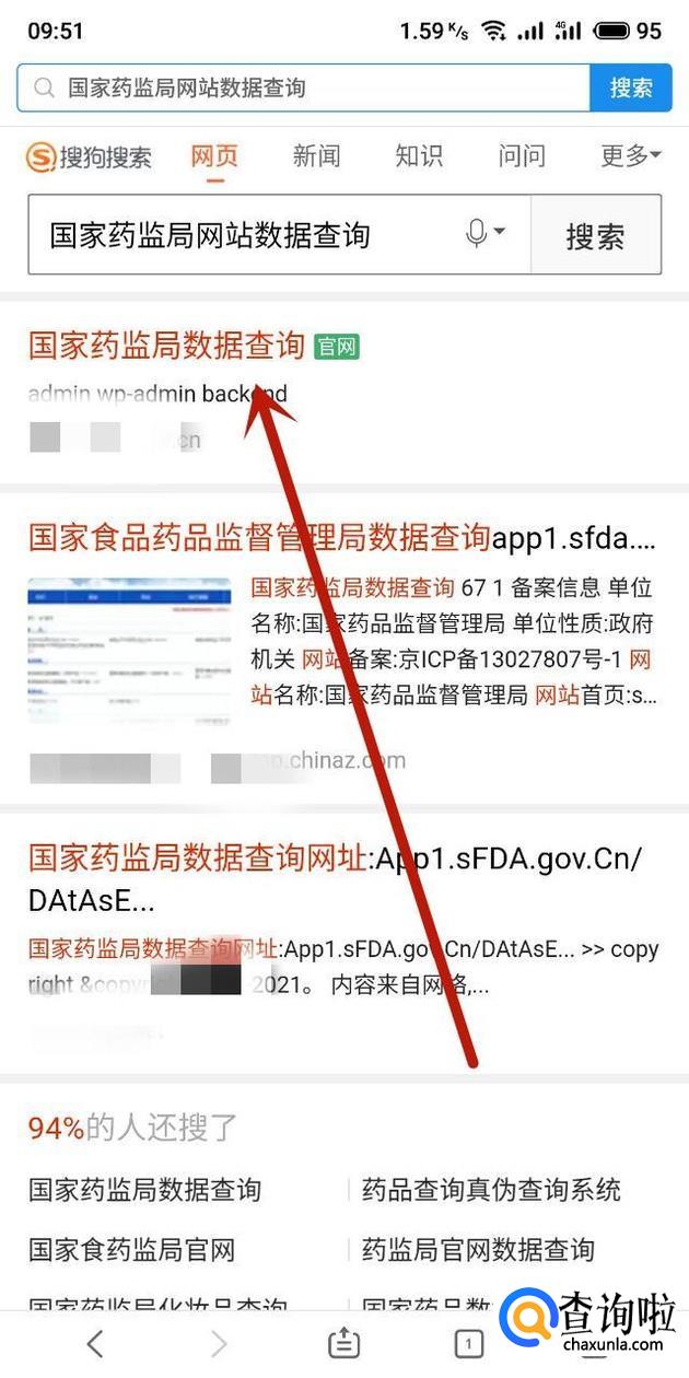 用搜狗搜索引擎搜索“国家药监局网站数据查询”,点击并进入,如图所示。