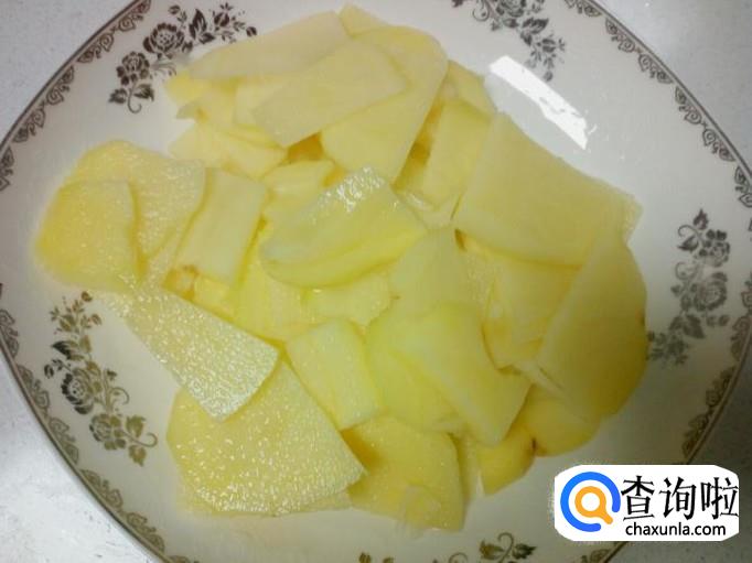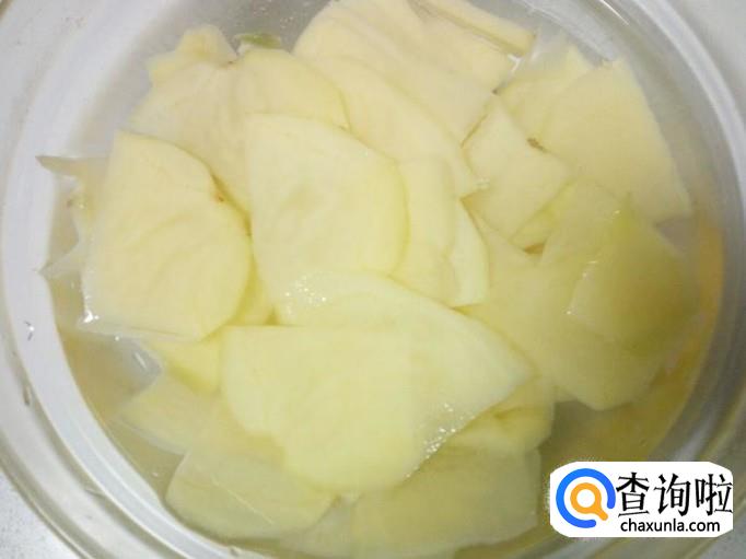 土豆去皮,用水清洗干净,控干水分,切成片。放入水中浸泡一下,去除淀粉成分,再用水投洗干净,控干水分。