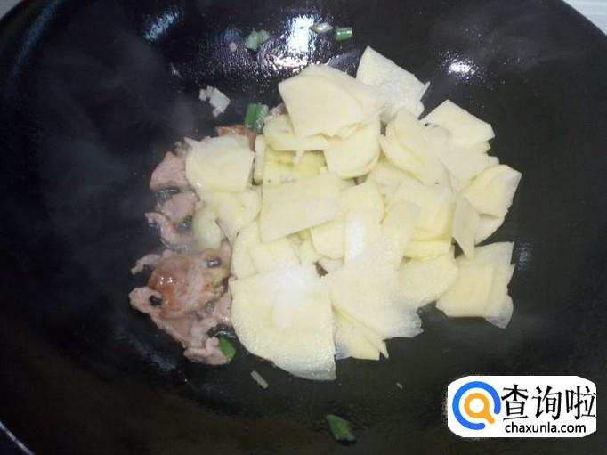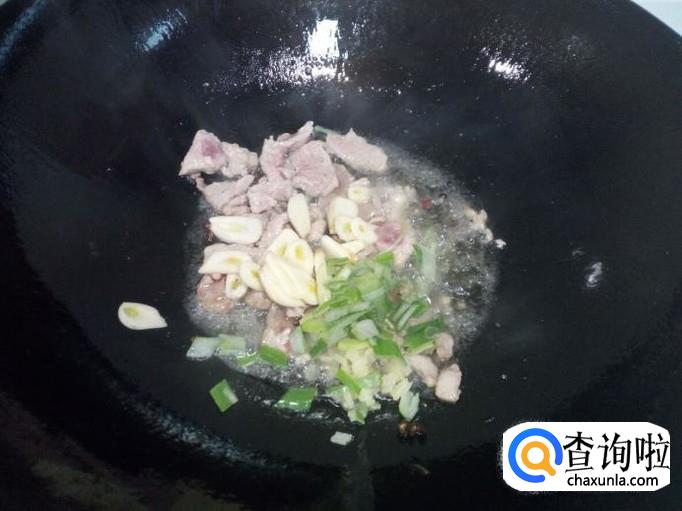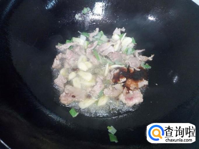炒至肉片颜色微白,放入葱,姜,蒜,翻炒,放入料酒,适量蚝油。