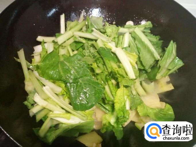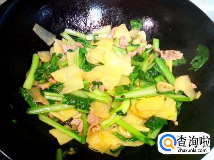 随即放入土豆片翻炒,放入盐。土豆片炒至六分熟,放入小白菜翻炒。
