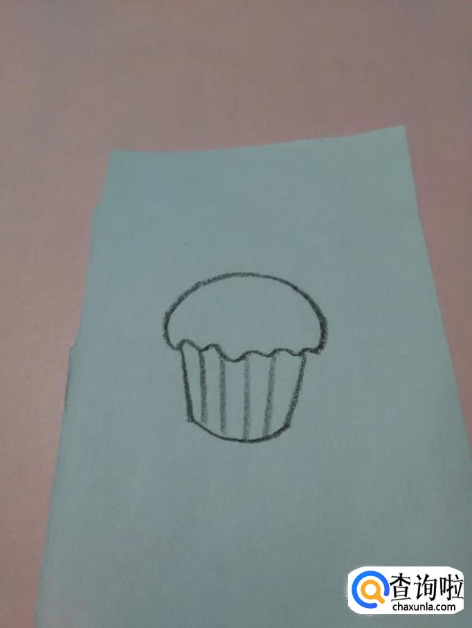在蛋糕下面,画两条竖线和一条弧线,表示杯托。