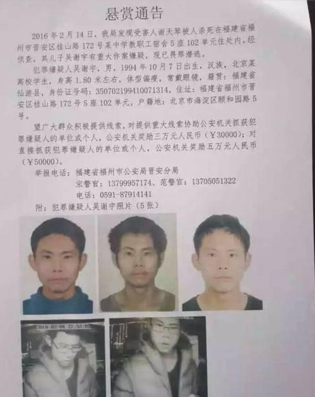 2016年3月3日,福州警方发布了一则悬赏通告。2月14日情人节,警方发现一名女子谢天琴死在福州一所中学教职工宿舍内,其22岁儿子吴谢宇有重大作案嫌疑,警方悬赏万元缉捕。犯罪嫌疑人吴谢宇就读于北大,作案后封死了住处,将尸体用塑料布层层包裹,还放入了活性炭吸臭。弑母后,还以母亲名义贷款。
