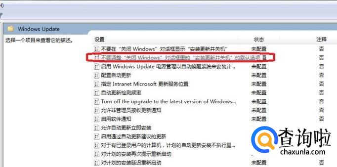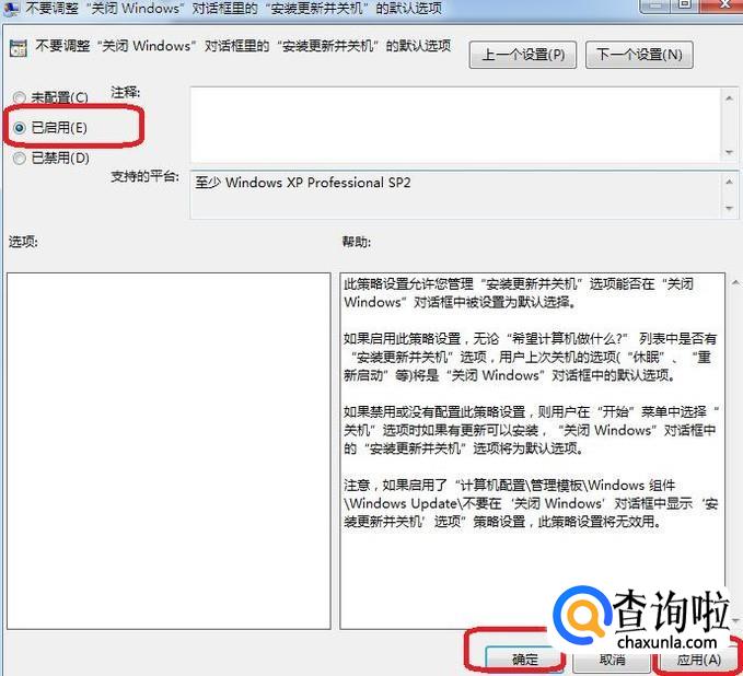 进行如图所示的选择,双击后,弹出面板,我们选择“已启用”此选项,确定之后,就不会再在关机时安装更新了。