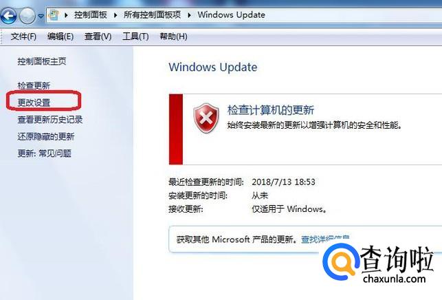 然后,我们点击左侧栏下方的“windows update”按钮,然后点击“更改设置”。