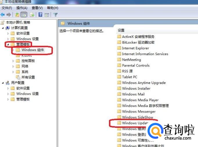 进入编辑器后,点击左侧栏的“管理模板”,“windows组件”,然后在右侧双击“windows update”。