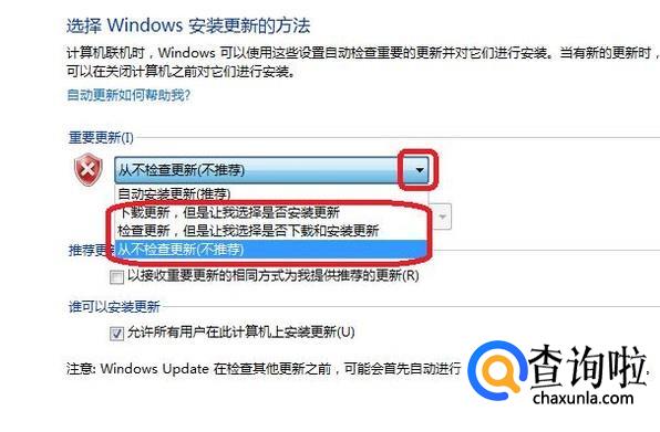 此时,就可以设置是否检查更新了,我们点击下拉菜单,只要不选择“自动安装更新”就可以,其他三项都不会再自动下载更新了。